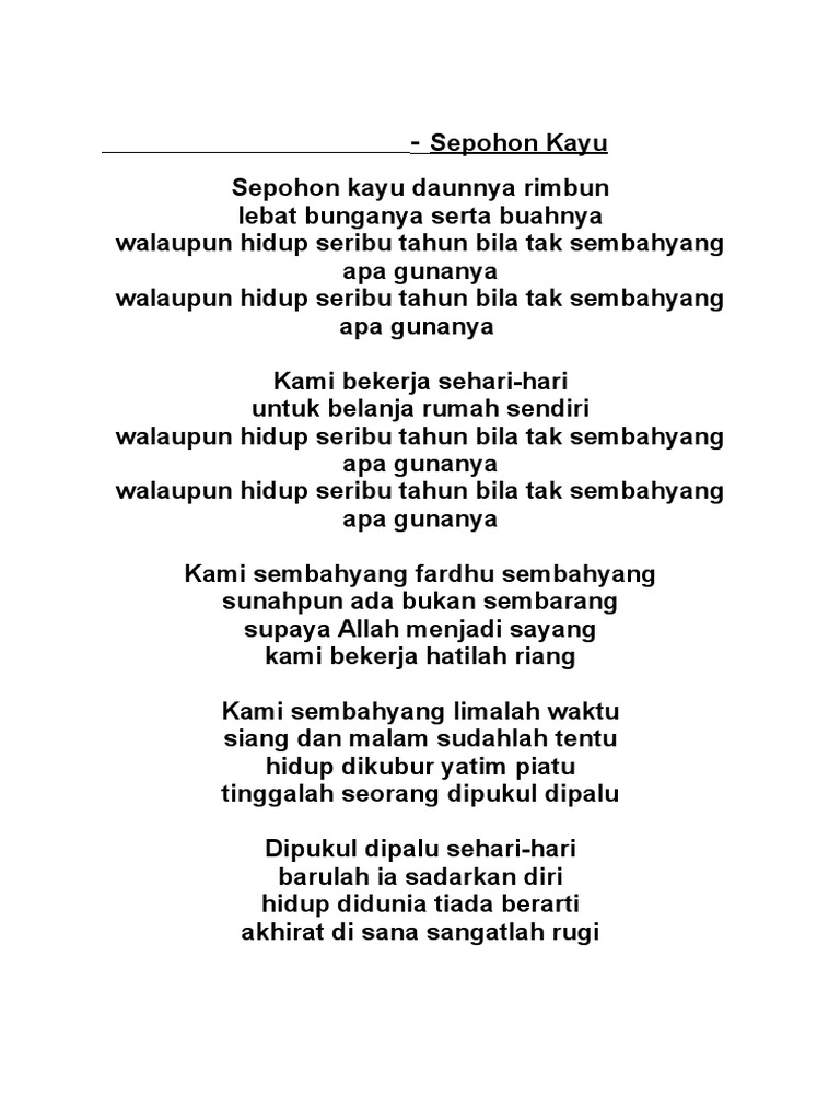 Sepohon Kayu 1 Sepohon kayu daunnya rimbun Lebat bunganya serta buahnya Walaupun hidup seribu tahun Kalau tak sembahyang apa gunanya Walaupun hidup seribu tahun Kalau tak sembahyang apa gunanya Kami berkerja sehari-hari Untuk belanja rumah sendiri Supaya Allah menjadi sayang. 000894Sepohon kayu daunnya rimbun. Blog lirik lagu ini tidak.